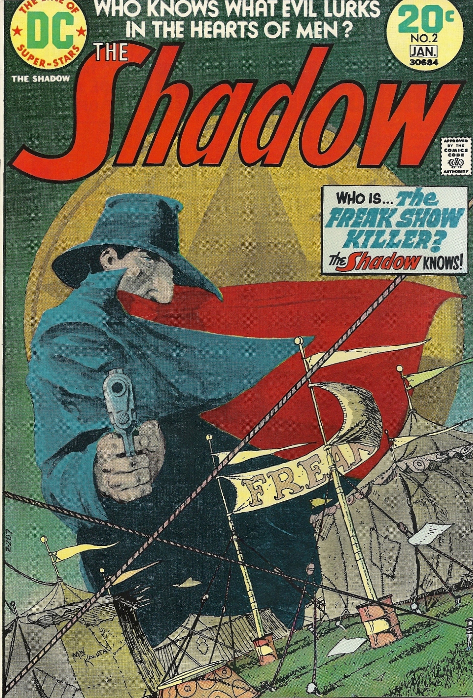 The Shadow has had a long run across multiple platforms, including a lead balloon of a movie in 1994 starring funny abusive father Alec Baldwin. Lamont Cranston — and his myriad other aliases — has also had his share of comic book iterations, including a fondly remembered one in the early 1970s of which this second issue is a part. He wasn’t woven fully into mainstream DC continuity — he did cross over into Batman for a nice little story —  and his solo adventures could be a mixed bag. But a freak show? I still curse HBO for cancelling Carnivale, so this issue might tickle my fancy. One can hope. At least his giant Jimmy Durante schnauze will fit right in with the bearded ladies and wolf boys.