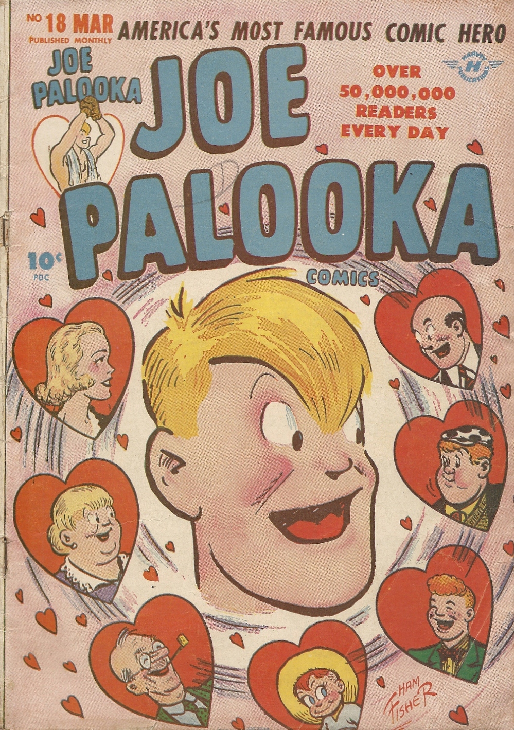 In case you’re equally ignorant, Joe Palooka was an upstanding newspaper strip boxer of old who most of the time dealt with sport-related hijinks, and occasionally, as every comic book character did in the early 1940s, battled Nazis and Japs. Think of him as sort of a good-natured American Ivan Drago, one surrounded by a predictable cast of pals, fiances and scamps. And the cover puffery seen above wasn’t idle boasting. He was enormously popular, with a broad, loyal readership. He was no Zippy the Pinhead, but…