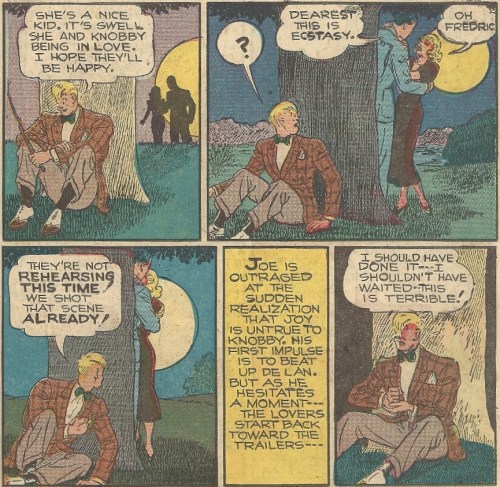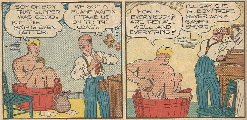 This issue, crafted by creator Ham Fisher, centers around Palooka and his Alfred Pennyworthish trainer, Knobby Walsh, heading out to Hollywood to work on a movie. Go West, young man, go West. But before they fly the final leg Joe has to take a bath in a horribly undersized oaken tub and Knobby has to polish his bald head: