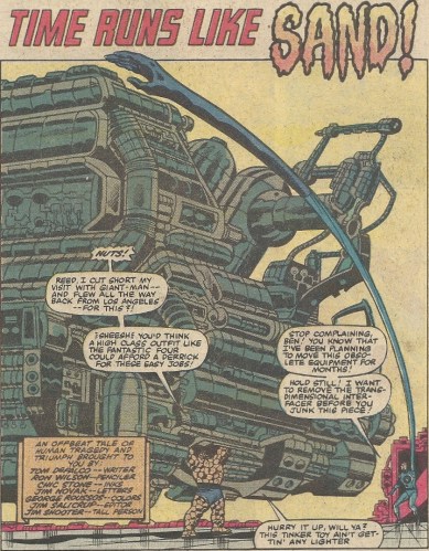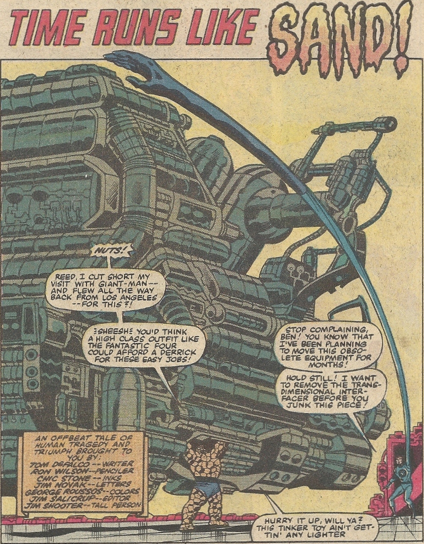The first half (Tom DeFalco, Ron Wilson, Chic Stone) opens with Ben aiding relentless genius Reed Richards with some Baxter Building spring cleaning. I have some sympathy for the big guy here. Being the only six-footer in a family of short people, I was always being called on to get things off of top shelves (and was left wondering why my short relations didn’t just store things on lower ones). Ben has to stop and wonder on occasion why the hell Reed doesn’t either A) build smaller or B) build his own moving crap.