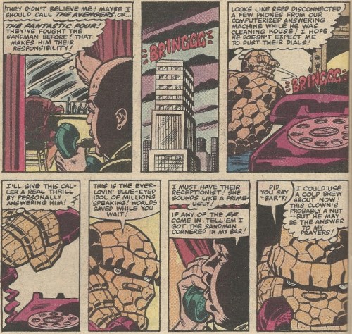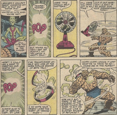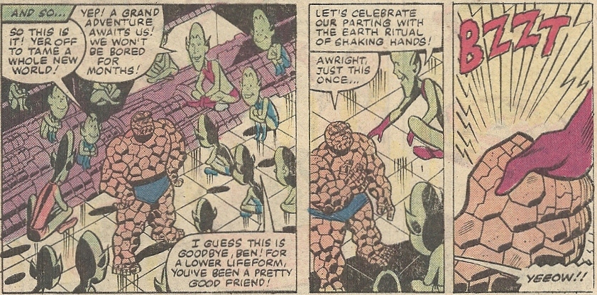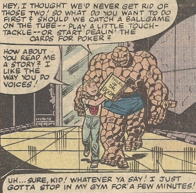 The Impossible Man, the guy that makes every hero pinch the bridge of their nose. Ugh. What’s worse, he’s sired children, a Kate Gosselinish litter. While the he uses Reed’s equipment to find them a new home planet to settle on/infuriate, Ben is beset by their miscreant monkeyshines. It’s a mercifully short ordeal, though, and before he goes with his scamps in tow, Impy can’t resist one final zap: