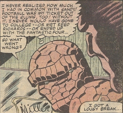 Watching the Thing get all frazzled by the Impossible Man and his bratty brood is nice, but the more interesting part of this twin bill is the first half. Once again, as with the Ghost Rider and Morbius pairings, we see Ben confronted with someone whose plight touches him (a pattern?). In this case it’s an outright villain, a two-bit thug with a bizarre power that’s driven him even further from the world he was never a part of in the first place. Cue the violins.