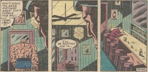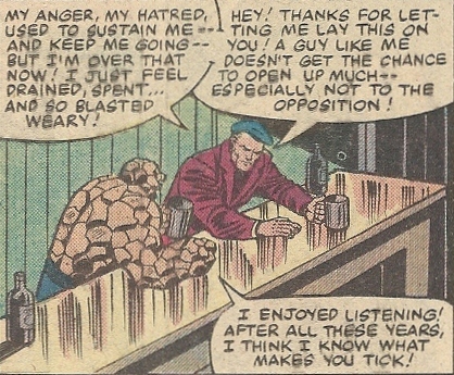 Marko’s crying in his beer highlights once again the fire and ice combo that made TIO so successful, a mixture of fun and pathos. Hokey? Yes. God, yes. In any other title all this woe is me malarkey would have everyone, including yours truly, rolling their eyes. But it’s the Thing.  Hokeyness is wound up in his rocky chunks. It works. A beer summit in the Mighty Marvel Manner!