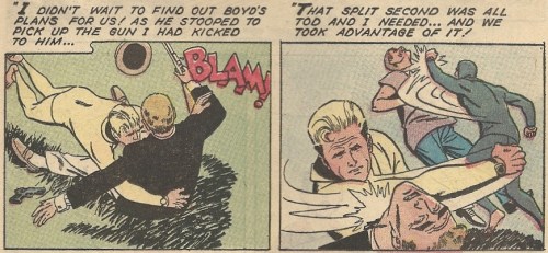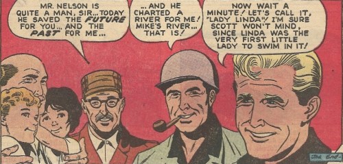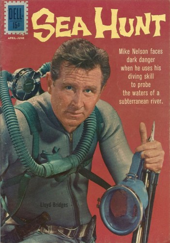 This comic, published in 1963 after the show ended (this is the last issue), is quite faithful to the original material. Comic book Nelson looks like Bridges, genial facial lines and all. The narration is in there and the diving adventures are (of course) present, though I’m relieved to note that the form-fitting crotch-huggers aren’t. Phew.