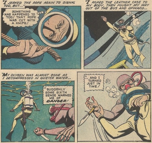 The first Mike Nelson story (Script: Eric Freiwald, Robert Schaefer, Art: Dan Spiegle) finds him having his R&R interrupted by murderous shenanigans. You get some underwater knife-play (which always reminds me of the Magnum, P.I. intro):