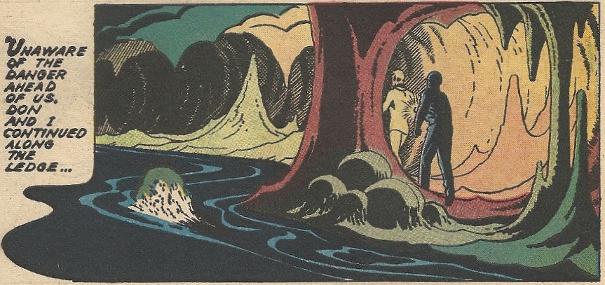 The second tale has Nelson trying to locate some lost fossil bones in an underground lake (rank that as one of the last jobs in the world that I’d ever want to do, up there with changing the light bulb at the top of the Empire State Building). I like a lot of the shadowy cave artwork in this one: