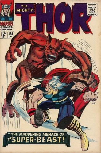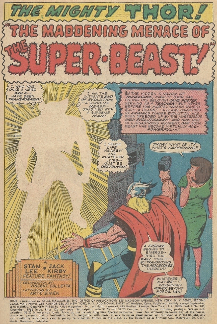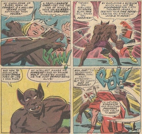 The relative kens(?) are immediately thrashed out in this Stan Lee/Jack Kirby/Vince Colletta masterpiece. The Man-Beast (one of the least imaginative monikers ever) materializes before Thor and Jane Foster and sets out to conquer the universe while no doubt marking his territory by peeing all over it (I’m getting flashbacks of Jack Nicholson in Wolf). His first step is to use his advanced intellect and supreme strength and pound the God of Thunder into the ground like a railroad spike, but the sinews of Thor have a little something to say about all that: