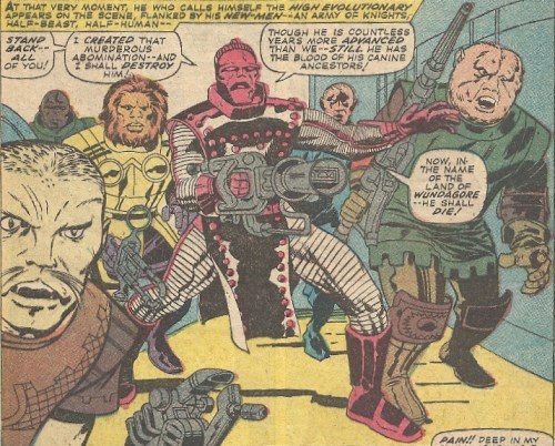 The man behind this million years hence wolf is, no surprise, the High Evolutionary (in his very first arc). Like all mad scientists, he sometimes has a hard time keeping his experiments in line, in this case the Island of Dr. Moreau-y New-Men of his genetic research colony, Wundagore. So what’s his big plan for subduing this particular rampaging creation?
