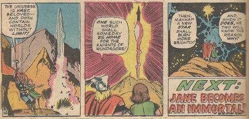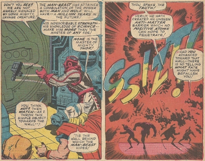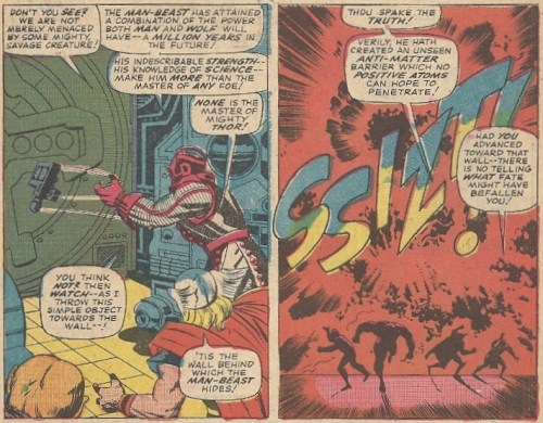 I mock, but it works. The Man-Beast covers his big, sensitive ears and flees, but takes refuge inside a vault (perhaps Burgess Meredith is reading somewhere in its innards). This is bad, because the HE has stored all his genetic advancement gear in there, and the wolf, if left to his own MILLION YEARS HENCE devices, will create a private army of animal-men. Thor is about to pound the sealed door down in a violent display of Norse bravado, but the High Evolutionary stays his hand: