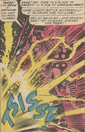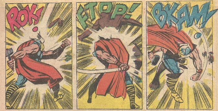 Thor unleashes the full might of Mjolnir, accompanied by wondrously onomatopoeiac sound effects: