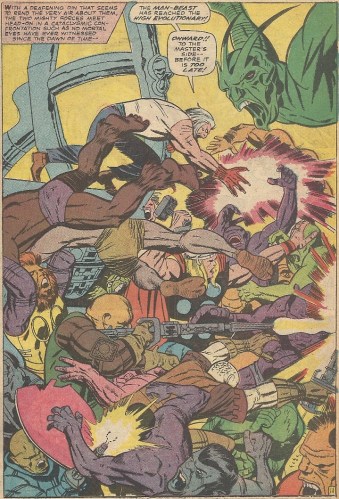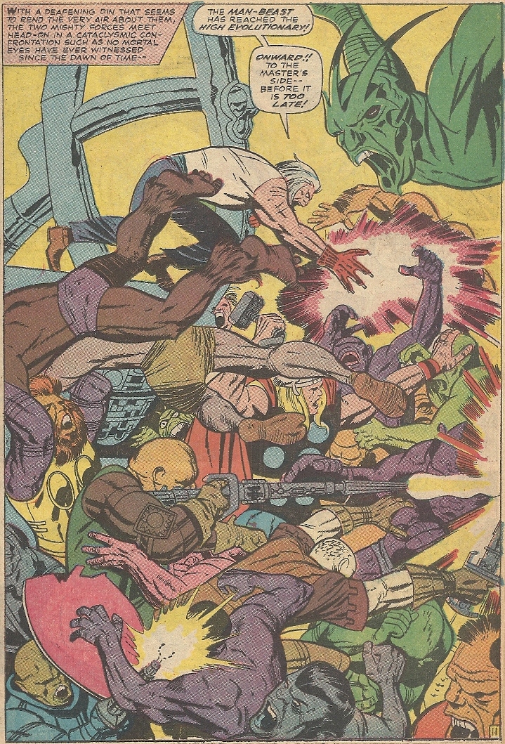 They’re too late — the wolf has formed his small army. They come thundering out and Thor makes a valiant stand. Some of the High Evolutionary’s good guy assistants mount a cavalry charge to help even the odds, leading to this glorious (I SAY THEE GLORIOUS) Kirby splash page: