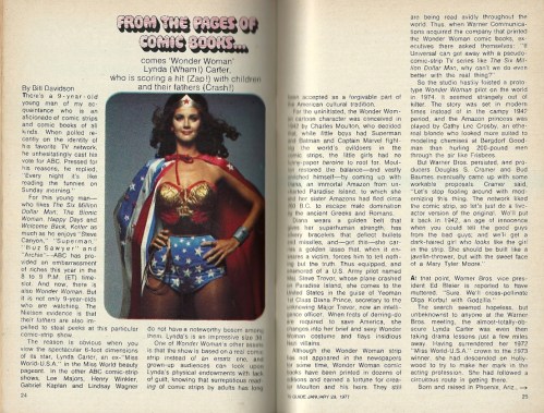 The Lynda Carter Wonder Woman was before my time, but I thought folks might enjoy this TV Guide article from during its run. Like a lecher’s eyes, this fluff piece goes straight to the star’s rack: