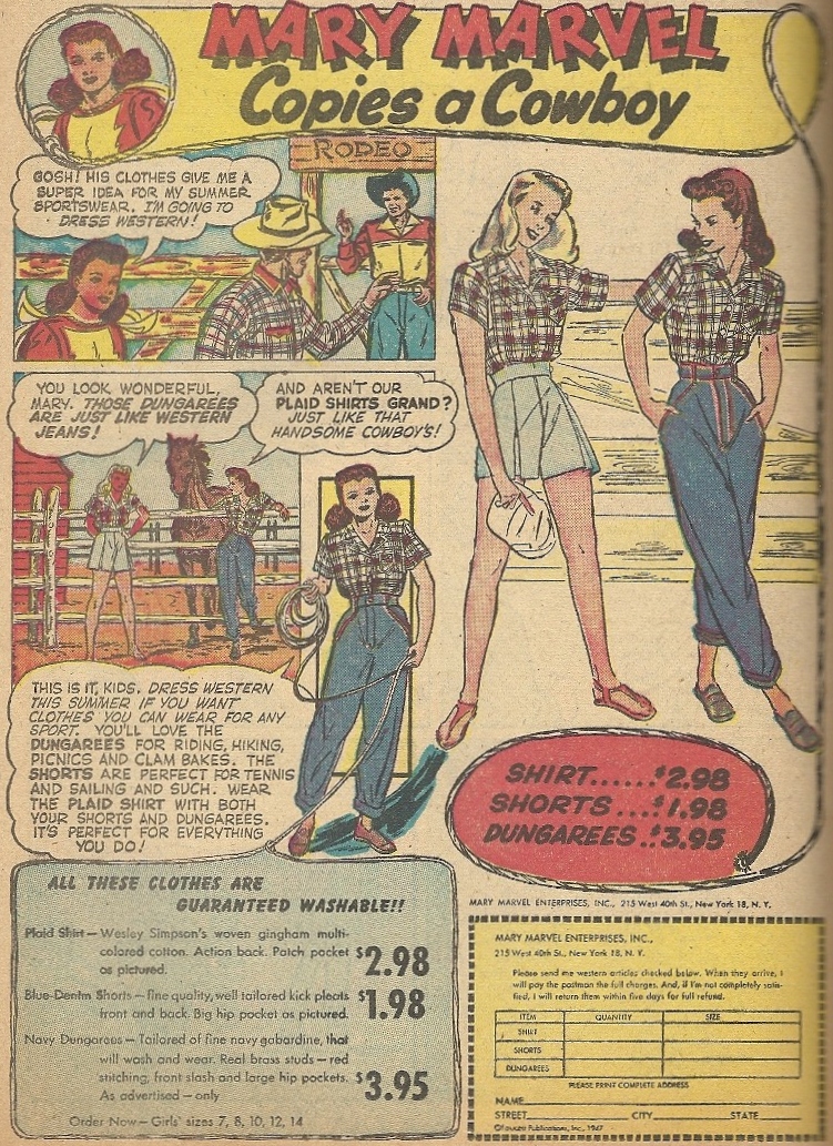 I can well imagine that a cowgirl Mary Marvel modeling her own line of dungarees and plaid shirts awakened primal urges in a few 1940s teenage boys. And a few girls, for that matter.