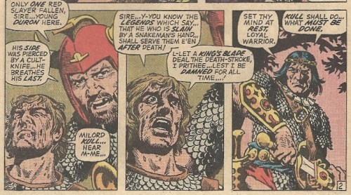 Did I mention Kull being a MAN? Well, he’s a very generous MAN, because when a loyal soldier needs a mercy killing, Kull is more than willing to do the Kevorkian honors (while speaking of himself in the third person):