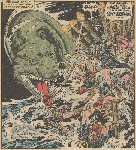 Kull isn’t just a conqueror. He’s a man. A MAN. Sit back and admire a Valusian king who has the wherewithal to STAB A GIANT SEA SERPENT IN THE EYE. Eat your heart out, Quint.