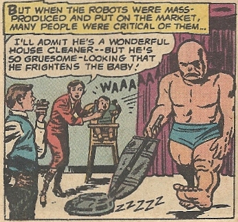 Two, merely reading the phrase “Jack Kirby draws a giant robot baby in a blue diaper pushing a vacuum” can make you smile. The execution can do the same:
