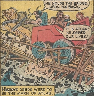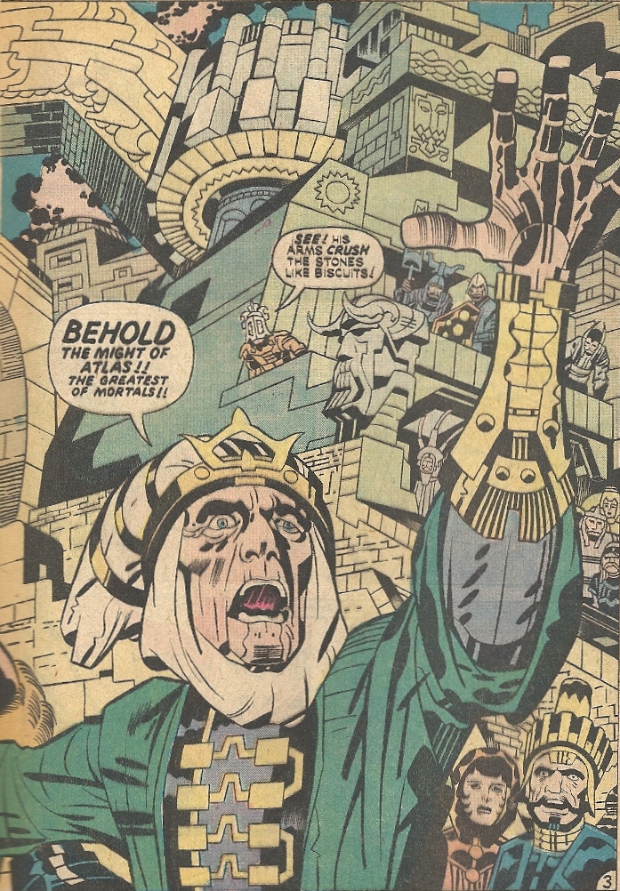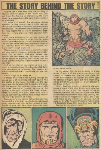 Sadly (or not), neither Atlas’ well-developed trapezius muscles nor this comic could get him an ongoing series. This now-depressing appeal for reader input and a series-launching sanction — using as it does Kirby’s track record, as if that’s supposed to spin straw into gold — serves as a grave marker: