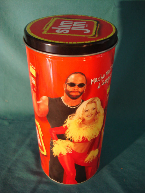Yes. A tin of Slim Jims with product spokeswrestler Macho Man Randy Savage on it, along with his valet at the time, Gorgeous George. Well. When I got over the WHAT IN THE NAME OF HEAVEN IS THIS AND WHY WAS IT SENT TO ME surprise, I had a good laugh about Macho. Look at him. He’s so proud. He has Slim Jims, a skank crammed into some tight leather and new hair plugs (no more neon hats for Macho). What more could a man want? OOOOOOOOOOH YEEEEEAAAAAAAAH.
