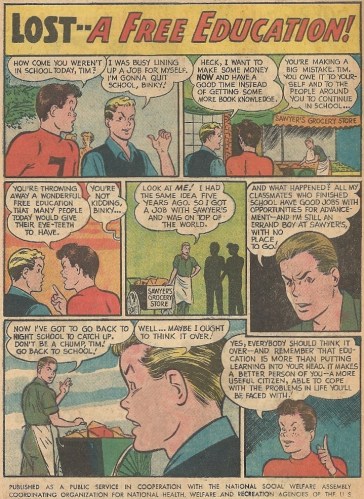 The little creep in red looks like he needs a good slap, what with his Snapper Carr mien and all. He’s devaluing book learning with every word that comes out of his smug mouth.