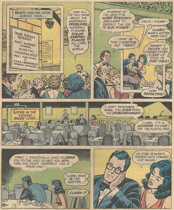 This comic takes a swipe at just what a yellow sun fueled super-metabolism entails, and the caloric ramifications of a Kryptonian super-tummy. You will be all the better for this knowledge imparted from on high. I think.