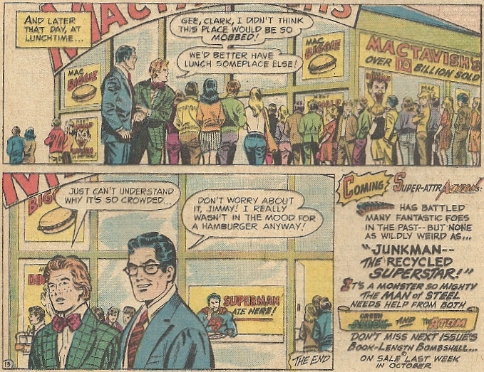 That’s MacTavish’s, the Earth-1 equivalent of McDonald’s. More on that in a moment. And, mercifully, Superman doesn’t corkscrew out a Randy Marsh sized movement after all this junk food.