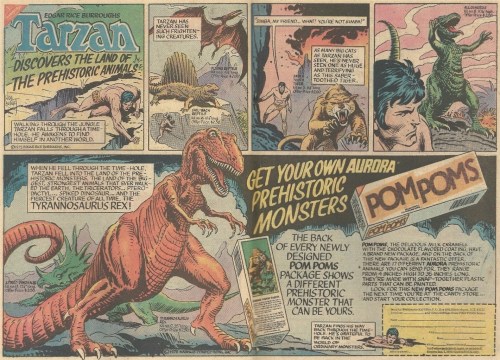 Could you really blame Tarzan if he broke character for a moment, dropped the pidgin English, turned to the reader and inquired as to what the hell he was doing braving dinosaurs and saber-toothed tigers to sell model kits and Pom Poms? SOMEONE GET THE EDGAR RICE BURROUGHS ESTATE ON THE LINE.