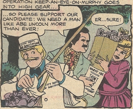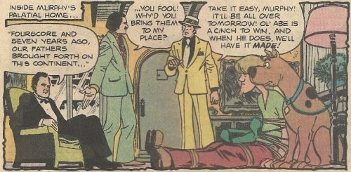 In the race for Governor in an anonymous state, the previous Republican candidate was felled under suspicious circumstances, and Lincoln threw his stove-pipe hat into the ring. The story makes clear that a candidate in this jurisdiction doesn’t have to be alive to run, which seems more than a tad nonsensical (Charlemagne for State Assembly!), and perhaps indicates that this gentleman is ZOMBIE LINCOLN. And no one questions what happened to a certain gigantic cranial entrance wound. Whatever. Our teens smell a rat (Dishonest Abe) and infiltrate Lincoln’s campaign headquarters (incidentally, his campaign manager looks a lot like Gabe Kotter). To get to the bottom of things, Shaggy and Scooby become “Lincoln’s” bodyguards, while the rest go deep undercover. Here’s Fred, MASTER OF ESPIONAGE: