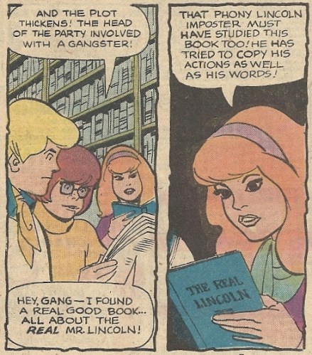 We may mock the disguise dexterity of the gang (Velma hides in bushes disguised as what looks to be a lesbian softballer), but they do manage to spot the manager (Murphy) hooking up with a shady character. Danger-Prone Daphne follows up by doing some sleuthing through books (a woman after my own heart), and finds the most conveniently titled book EVER for a person trying to find information about the real Lincoln — a tome called The Real Lincoln:
