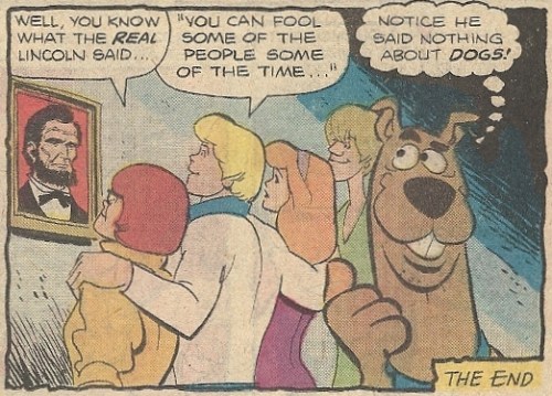 Yes, Abraham Lincoln, no stranger to the sometimes bizarre environs of a comic booky world, kind of, sort of (not really) makes an appearance in these pages. Yes, he interacts with a giant talking dog and his hashish-addled friend. No, the story (sadly) doesn’t involve Scooby, Shaggy, Fred, Velma and Daphne travelling back in time and getting blown to pieces in Pickett’s Charge. There are trade-offs in this comic just like there are in real life. YOU CANNOT HAVE YOUR CAKE AND EAT IT TOO.