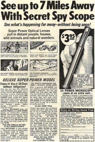 Speaking of numbers, color me skeptical on the “7 miles” boast. But, if true, you could pair this Secret Spy Scope with some x-ray glasses and become CREEPY VOYEUR EXTREME.