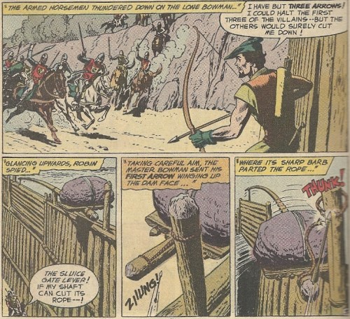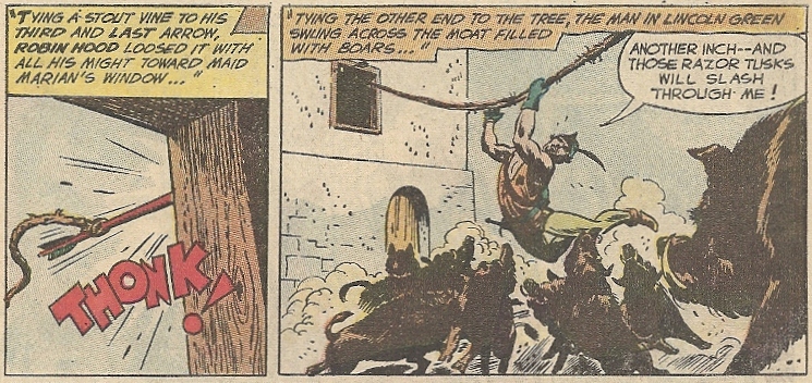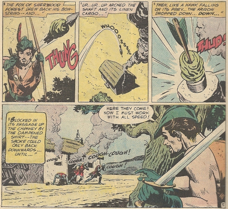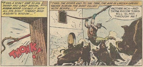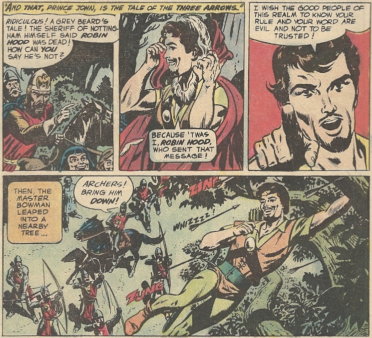 In a broader observation, Robin Hood can at times come across as a bit of a taunting prick. A little bit of this can be glimpsed in these last panels. He laughs and teases his way into the protective shroud of Sherwood Forest, and Prince John is left to fume and wag his mailed fist. The sequence could be subtitled with a simple NYAH NYAH. Whatever Robin’s virtues, I’d say that he sometimes lacks the cognizance to know when to quit rubbing it in, like Shazzang in that old TV Funhouse skit. If he shot the Sheriff in the ass with an arrow, he’d then moon him just to show that his own cheeks were still pristine and UN-arrowed.