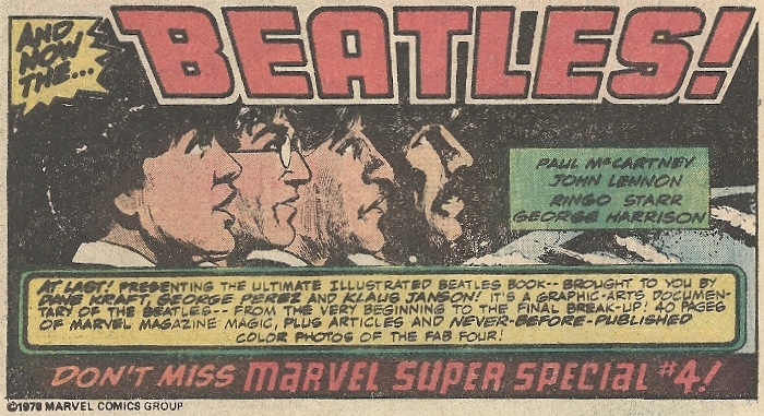That the 1978 Marvel Super Special adaptation of the Beatles’ story was advertised not once, but twice in the Devil Dinosaur comic featured yesterday, is a testament to the lingering power of Beatlemania. You can almost hear Ed Sullivan calling it a “really big book.”