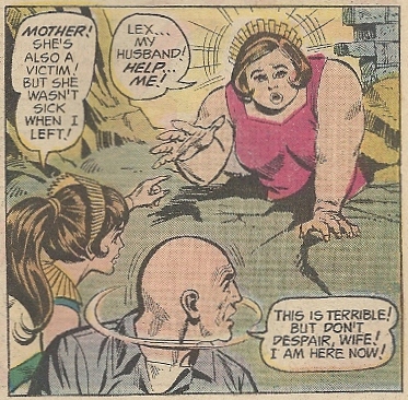 I’ll hand it to Lex: If I were him (i.e. a career criminal) and I returned to my wife and saw that she’d morphed into some Biggest Loser land-grazer, I don’t know that I’d take it as well as he does here. He immediately gets going on the cure. I’m a bit surprised he didn’t pull a Newt Gingrich and serve her with divorce papers, what with him being a great evil mastermind and all. Or at least say that he had to get something from the car and the last thing she’d ever hear of him would be the sound of squealing tires — something like that. But love conquers all, even for villains.