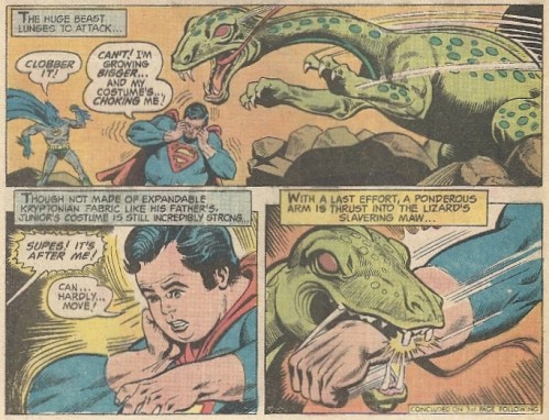 The Super-Sons. Remember them? They stowed away on the rocket ship (with Supes still mooning over Dora), but are neutralized quickly when Superman Jr.’s powers are nixed by the red sun. USELESS. But they’re suddenly needed when it’s revealed that Lex’s lab, which stored the gigantism cure, has been destroyed by an irradiated meteor. What’re the odds, right? Lex zaps young Supes with yellow energy top re-power him, and off the Sons go in search of a special Lizard that has a venom which holds the only hope for Lexor and its legion of fatties. And the Sons find it just in the nick of time, because Superman Jr. is morphing into John Candy: