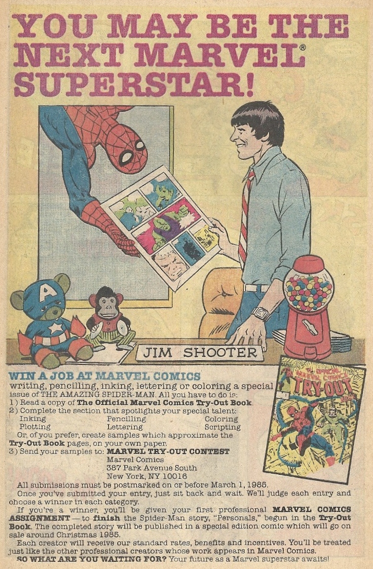 I think we can all agree that completing the Marvel Try-Out book, sending it in the Marvel offices, and — dream of dreams — landing a job at the House of Ideas would be a comic lovers Horatio Alger story. But meeting with the eight-foot tall Jim Shooter — a man who’s burned a bridge or two in his day — would be a bit intimidating. No matter how many gumball machines and stuffed animals were strategically placed on his desk.