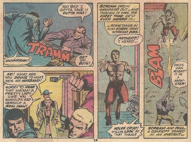 Same with Mantlo. He’s trying so hard here, maybe too hard. Take Woodgod’s “scream” verbalization, which I think is supposed to be a simple mind’s symbol for man’s inhumanity to man. Violence, that sort of thing. I think. I don’t know. The point is, Mantlo’s trying so hard to make this little comic deep, into some Rod Serling meditation on the folly of man, when really all it should be about is the silly FrankenPan that gets grown and grafted and inadvertently unleashed on the world without any pants. Like Giffen and Janson, he’s young and hungry, and probably a little over-eager. This outpaced ambition detracts from the comic’s objective quality, but it’s endearing, and that latter point matters more than the rest.