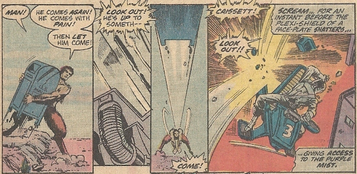 The men and their dopey contraptions are shot down in rapid succession, and one man dies instantly when Woodgod busts open his faceplate and exposes him to the toxic air. Yes, the deadly air that killed every man and beast for miles and miles around, but not that the dog and the man were traipsing about in a few pages and a few moments before. IT DOES NOT SEEM THAT THIS WAS A WELL THOUGHT OUT PART OF THE PLOT.