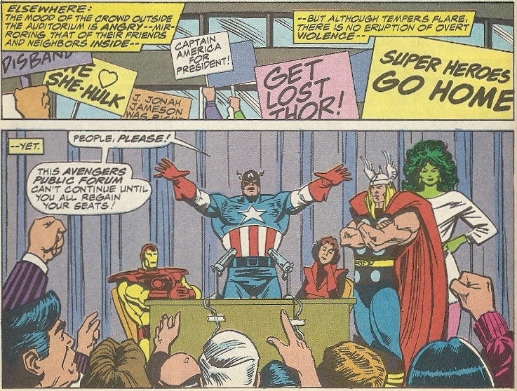 Glad to know that I’m not completely out on a limb with the Byrne thing. The Avengers PTA meeting isn’t all that funny on its own, but it is when you imagine Tony Stark dozing off inside his inscrutable armor.