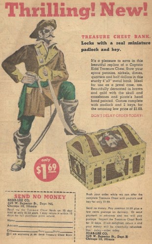 This is the last of the delicious 1940s ads from that Golden Age Daredevil book. If this treasure chest bank came with a hollowed out pegleg in which you could keep a stash of rum, THEN MY WORLD WOULD BE COMPLETE.