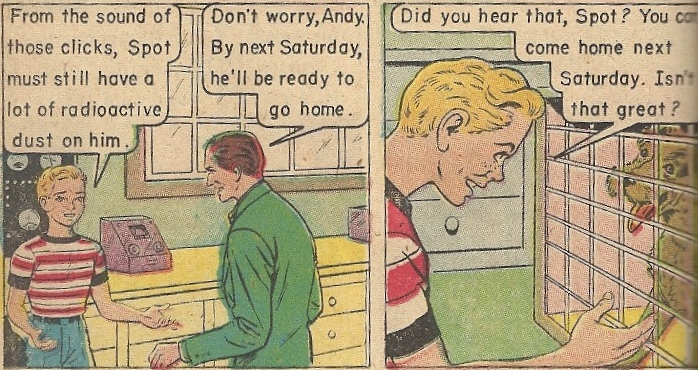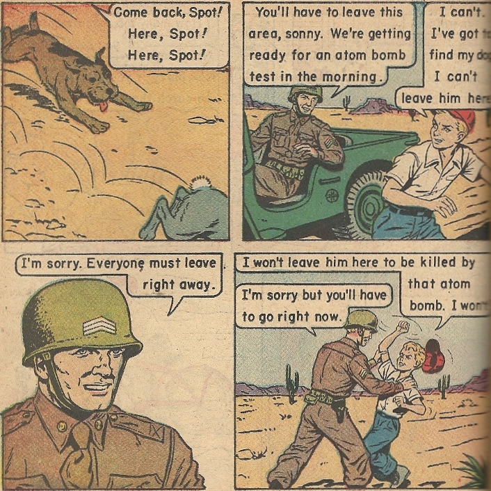 Our vehicle through this wide-eyed trip through an irradiated world is Andy, a young cap-wearing lad who lives with his Mom and Dad perilously close to a nuclear testing ground. How close? Close enough to stumble into a heap of trouble when his dog, Spot, runs off after a rabbit: