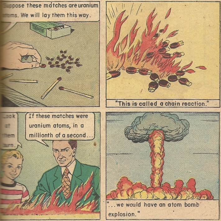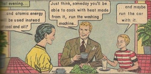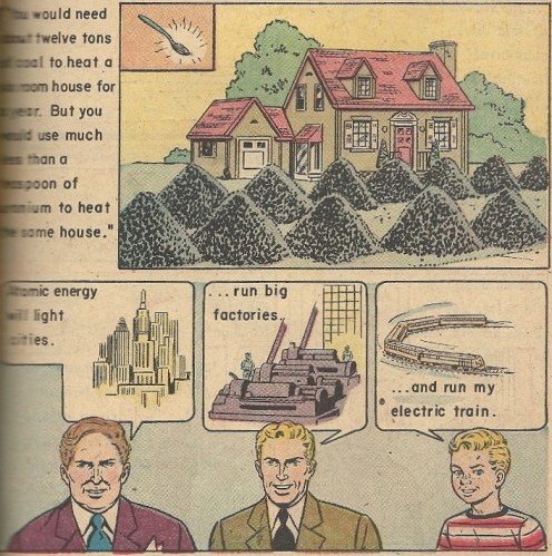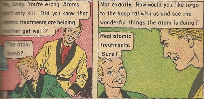 In a bit of kismet, someone in the last couple days posted a series of brief shorts from the 1950s extolling –you guessed it — the wonders of atomic energy. The first one you can find here, though it’s the third part that you’ll find the most similar to the above material. It takes much the same tone as this comic, but without the wide-eyed “aw shucks” curiosity of the aggressively freckled Andy. Check them out. Misery loves company, and so does infoganda.