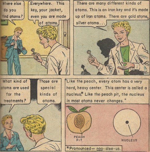 Andy and his father go to the local hospital, where the missus is undergoing radiation treatments for an undisclosed ailment. A fetching blonde lab technician appears on cue to explain the healing powers of the atom, and milks a peach metaphor for all it’s worth, first by telling Andy that “if an atom were as big as a peach, then a peach would be as big as the whole, wide world.” AND WHAT A WONDERFUL AND JUICY WORLD THAT WOULD BE, I might add. Then she takes it a step further: