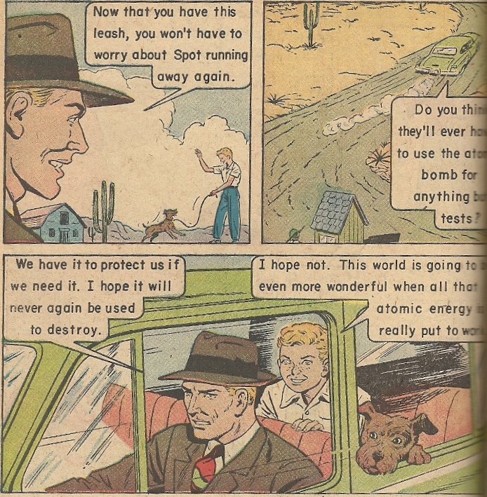 What to make of this? To be fair, this “story” was written long before Three Mile Island, Chernobyl and Fukushima became buzzwords, and no one disputes the benefits of atomic energy. And this is obviously directed at younger readers, with all the simplification that comes with that. But this thing is writing checks it can’t cash. Its sunny optimism is too much, and it has all the multi-faceted impartiality of a cult brochure. I found myself waiting for the bomb-worshipping mutants from Beneath the Planet of the Apes to spring out of the woodwork at any moment.