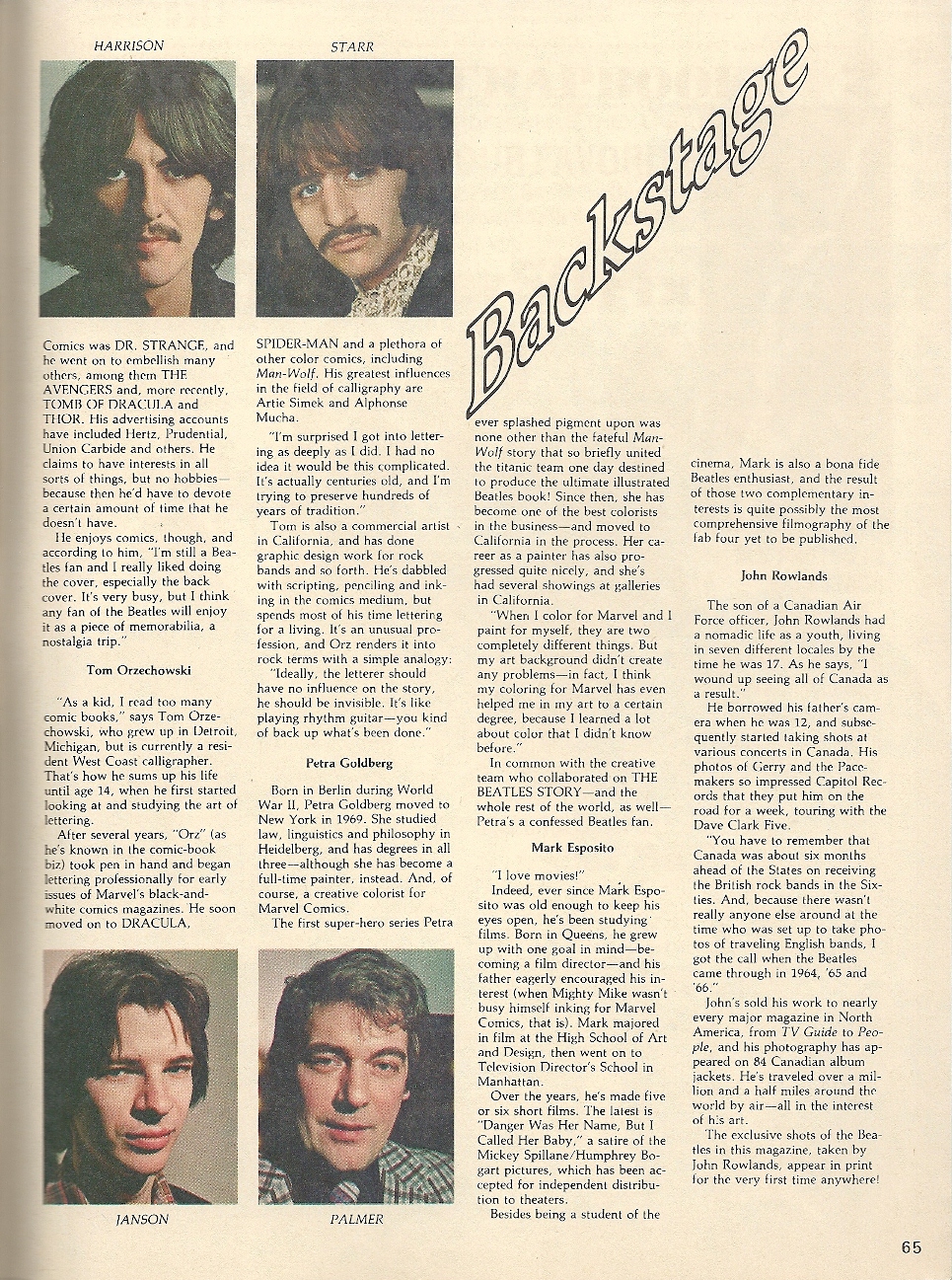 A little over a month ago I posted a couple of ads for this mag, and a comment pointed out that Ringo looked odd. That’s not so much the case in the comic proper, though later in this chronicle of the Beatles’ career, when they all started sprouting facial scruff, Mr. Starr bears a passing resemblance to Baba Booey. Most of the likenesses, however, are passable at worst, and excellent at best. The photographic reference work is mentioned in a portion of the extra materials (which are the obvious discographies and fluff articles, nothing too astonishing). That morsel can be found in the Marvel biographies below, as well as a few other items of interest: