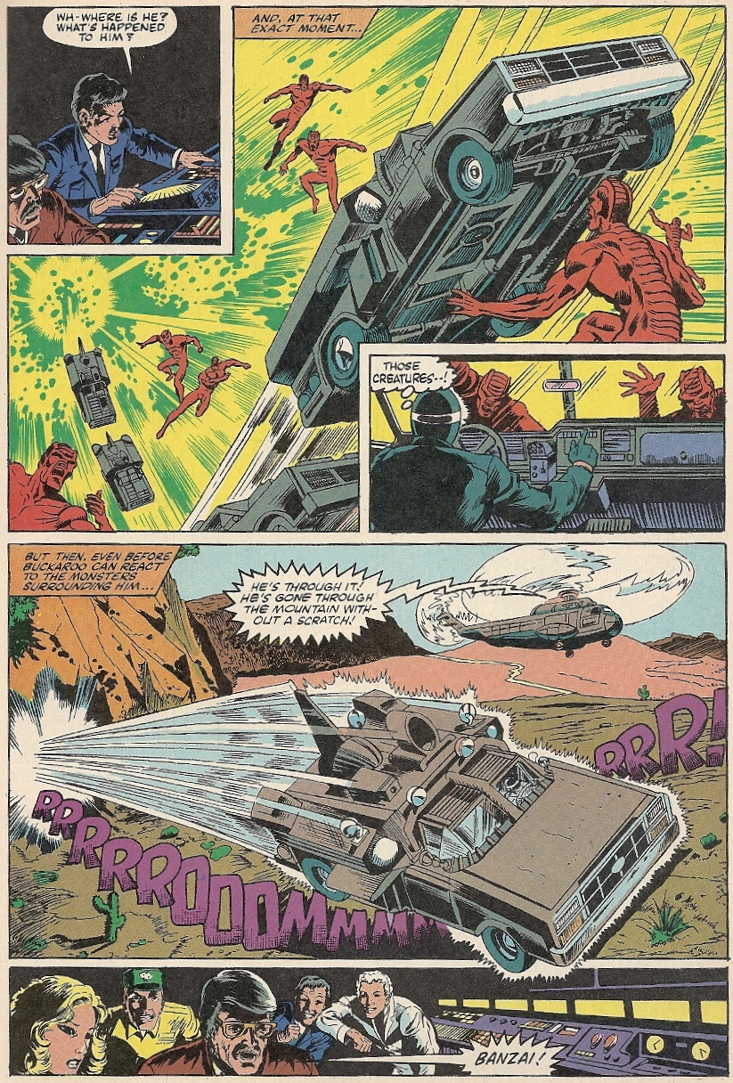 The comic is faithful in this regard: it was a chore for me to read, despite scripting from the normally reliable Bill Mantlo and pencils — and a nice painted cover — from a young Mark Texeira (Armando Gil contributed inks). Yes, there are the chunks that might intrigue, like Banzai test-driving his rocket car, phasing through a mountain and seeing monsters along the way: