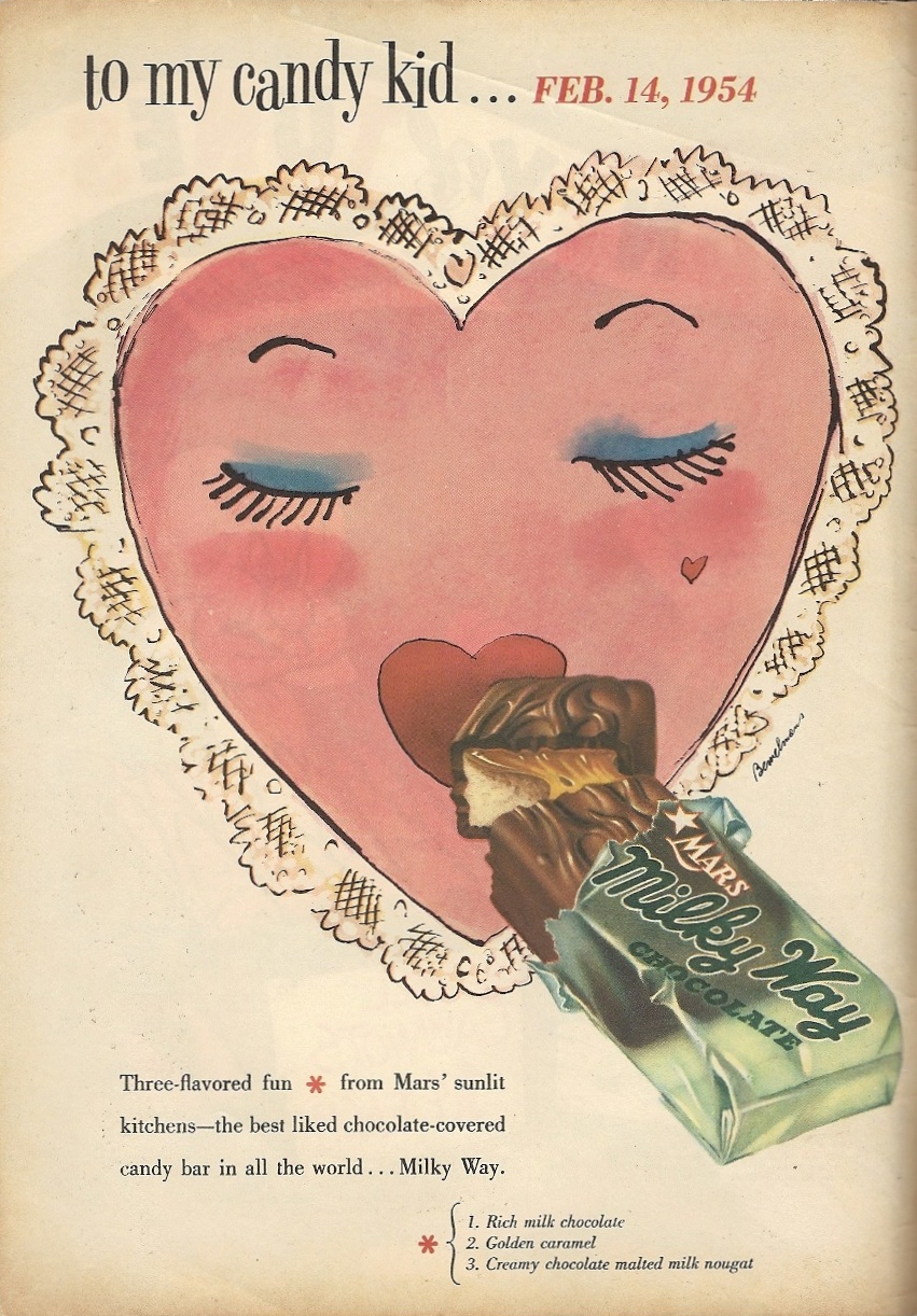 The pink heart. The flushed cheeks. The heavily lashed eyes closed to better savor the ecstasy. A chocolate bar meeting the red, luscious lips….