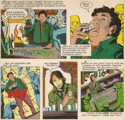 Another winning feature of the comic is discovering how iconic scenes are handled differently, either because of medium constraints or because they were unsettled in the script and altered on the set. Marion’s drinking bout against the fat guy that kind of looks like Benny Hill is a treasured moment for many, and it’s one that gets a lot more wordy in the comic: