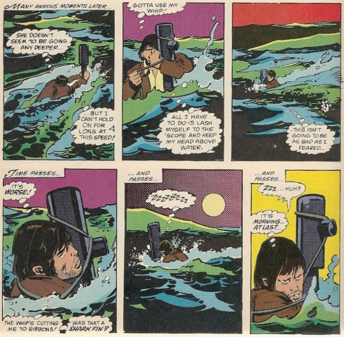 Last, it’s necessary to note that the this adaptation took the time to explain one of the more maddening omissions in the film. Everyone scratched their heads when Indiana climbed up on top of the German sub, the sub dove, and the next thing we knew — after a red line was traced on a map, natch — the sub and Indiana wound up at a hidden Nazi base. (When I was younger I assumed that the sub coasted along the surface and Indy hugged the hatch — sort of like Han Solo’s gambit to stick on the side of a Star Destroyer and float away with the garbage. Hey…) The long and deleted bodysurfing adventure of our hero is here presented in all its unlikely glory: