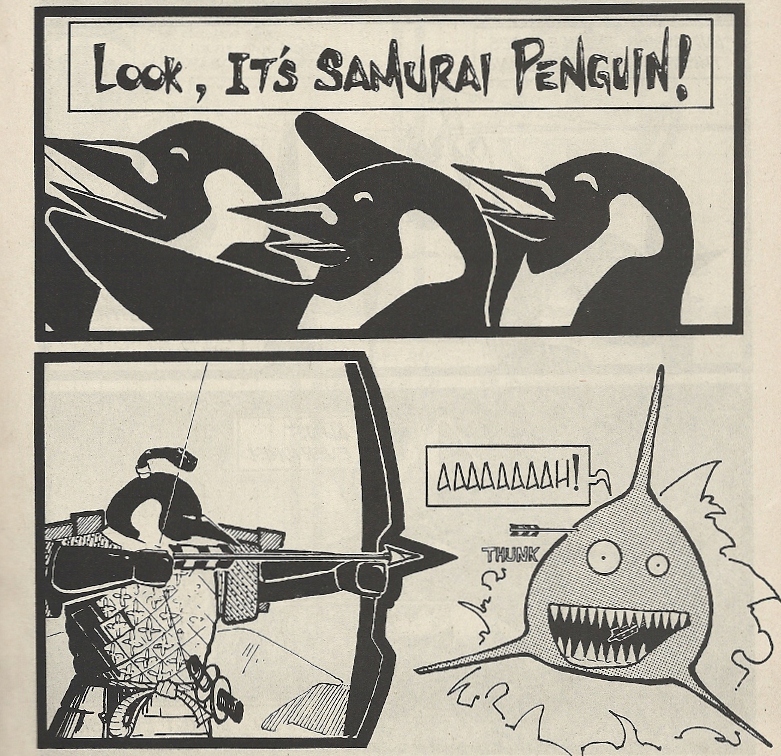 If the cute and cuddly dancing penguins in Happy Feet make you want to puke, might I suggest this antidote – Samurai Penguin #1
