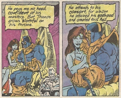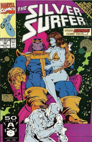 As alluded to above, there’s no sex in this book. Nevertheless, there are some opportunities for kinkiness. It’s no stretch of the imagination to envision these panels, with Thanos stroking the bikini-clad Death’s cheek and tugging on the Surfer’s leash, evolving into a three-way: